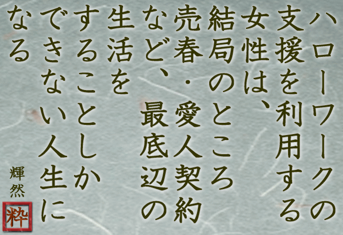 | 先生はおっしゃった。「そのような生き方は、結局のところ、売春・愛人契約などを結ぶことになり、幸せになることはない」と。 |