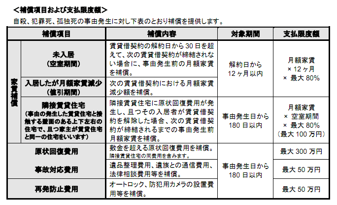 孤独死: 居住者が一人暮らしの場合において、誰にも看取られること無く、賃貸住宅内で死亡し、その死亡により賃貸住宅に敷金を超える原状回復費用が発生した場合をいいます。